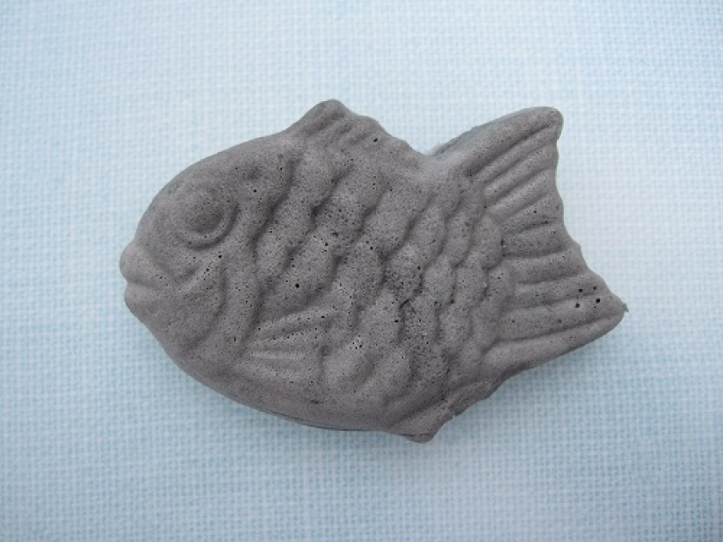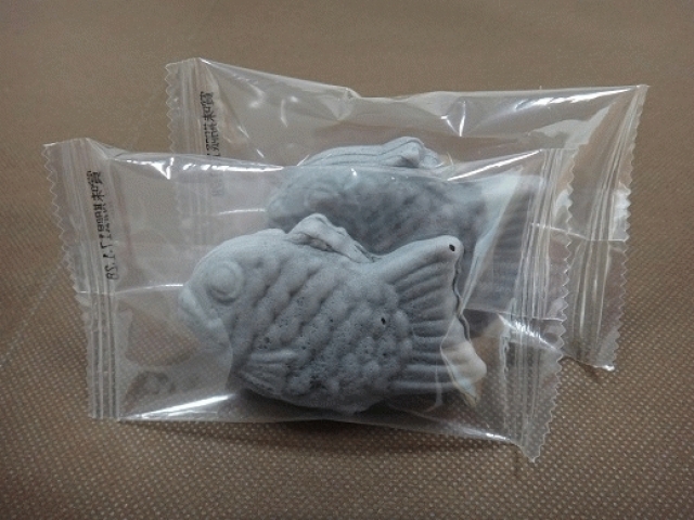 竹炭を使用した黒色のもちもち生地のミニたいやきです。ゴマ団子のような味わいです。