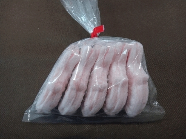 薄いピンク色のもちもち生地のミニたいやきです。いちご風味の白あんが入っています。